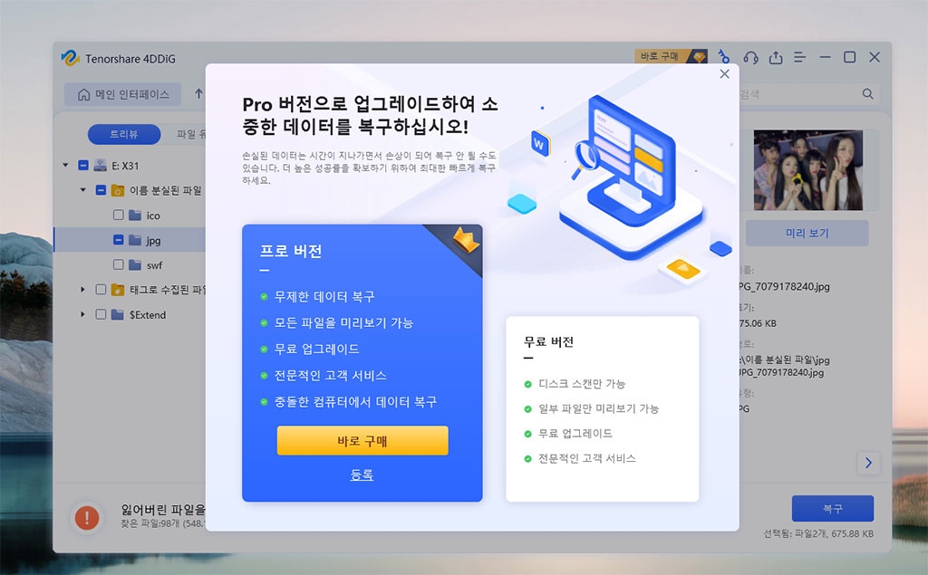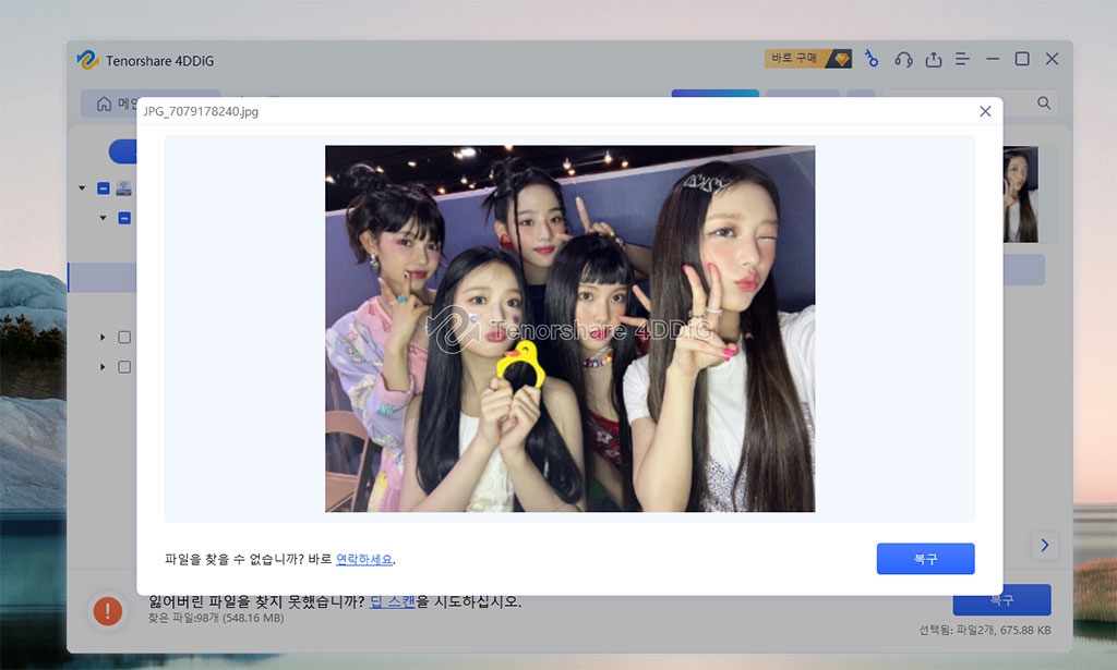삭제된 파일인 뉴진스 사진이 보이네요. 미리 보기를 통해서 복원할 파일이 맞는지 확인할 수 있습니다.