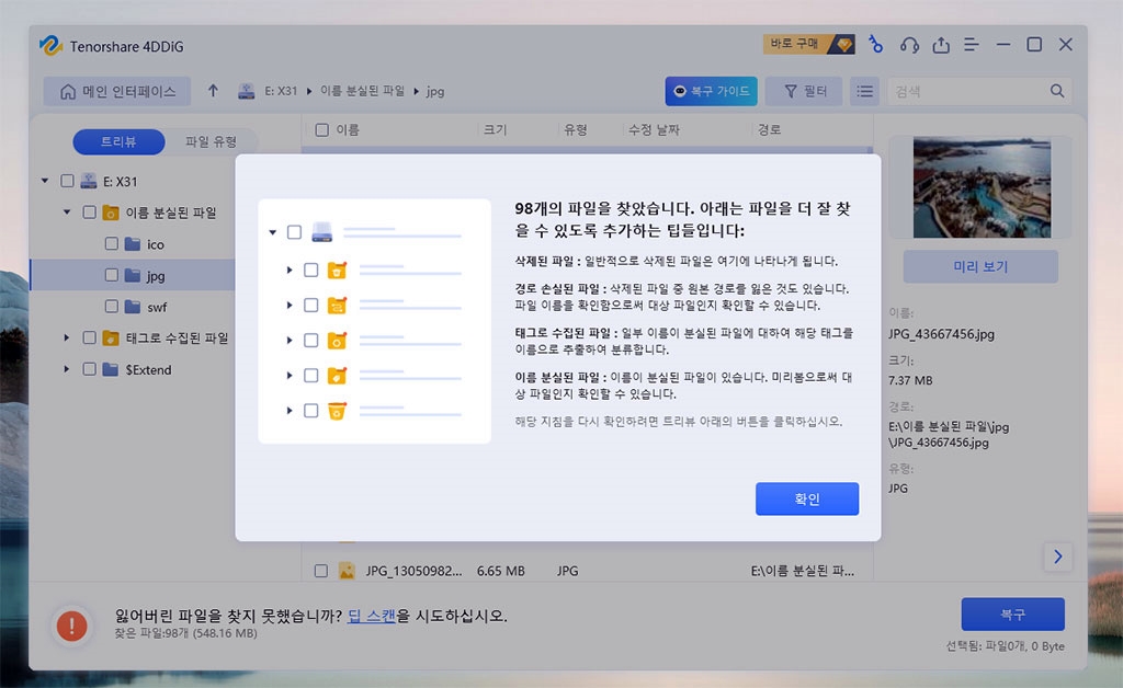 삭제 파일 복구 프로그램인 Tenorshare 4DDiG을 정품 인증 후, 다시 스캔해서 복구했습니다.