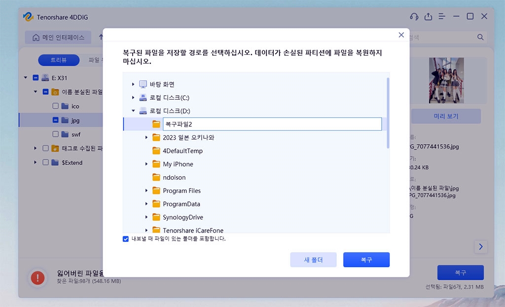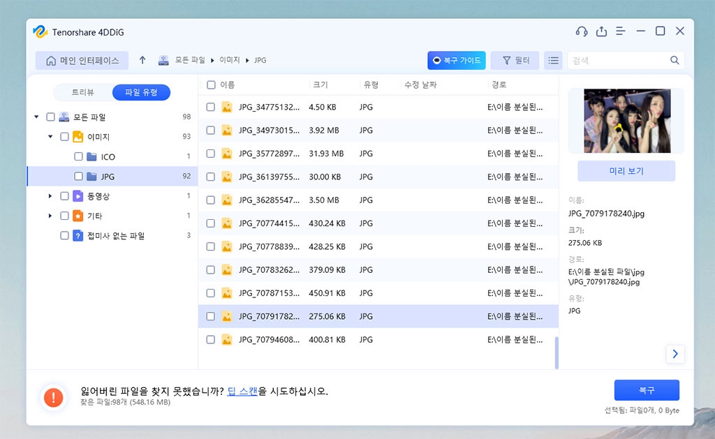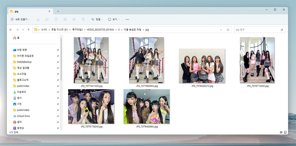 미리보기 해보니 깔끔하니 복구할 파일을 알 수 있죠? 뉴진스 배경화면 사진을 찾았네요.