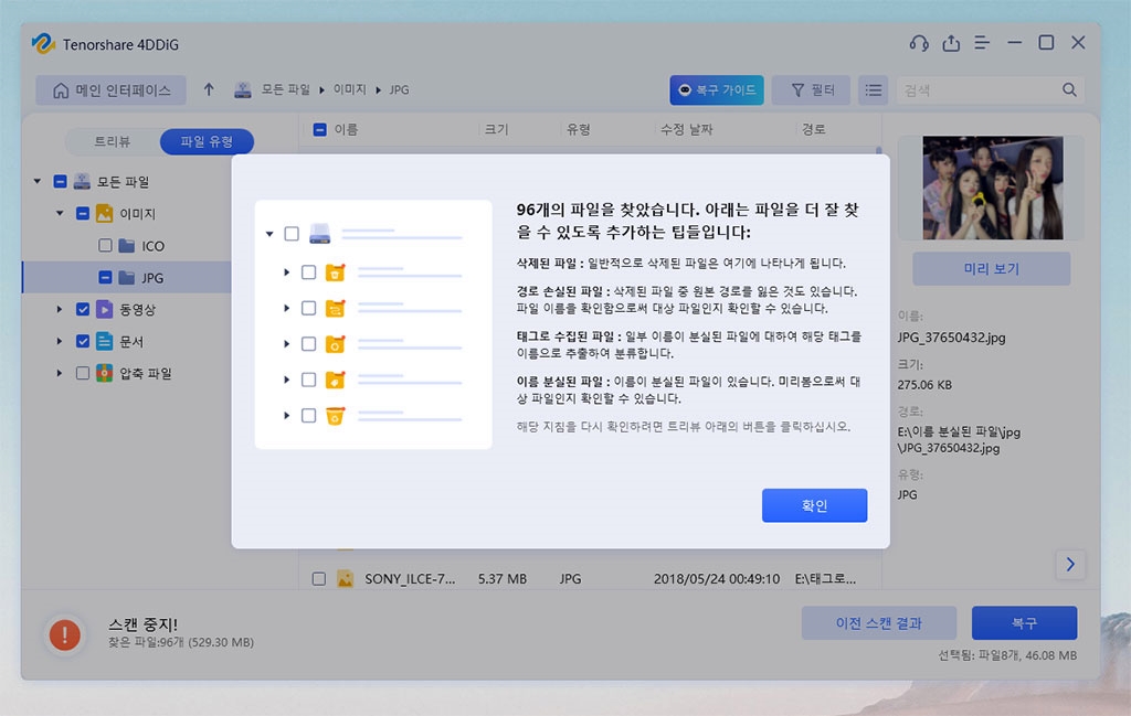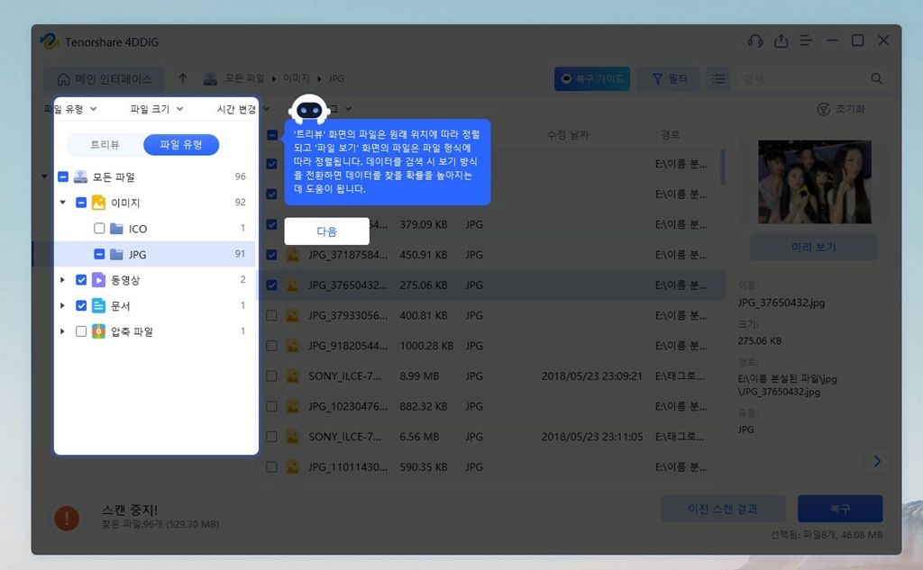 또 심층 스캔 도중 복구할 파일을 선택해서 미리 보면서, 스캔을 중지하면 시간을 절약할 수 있습니다.