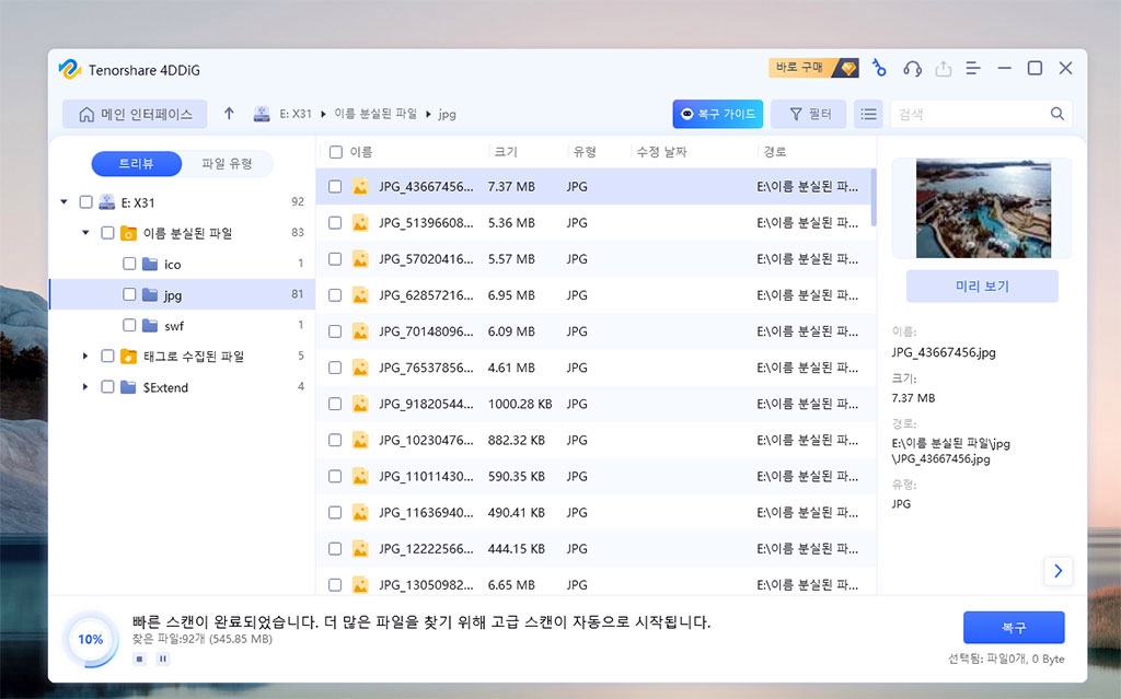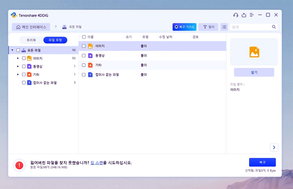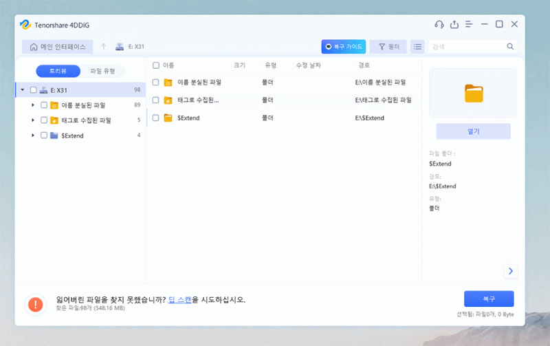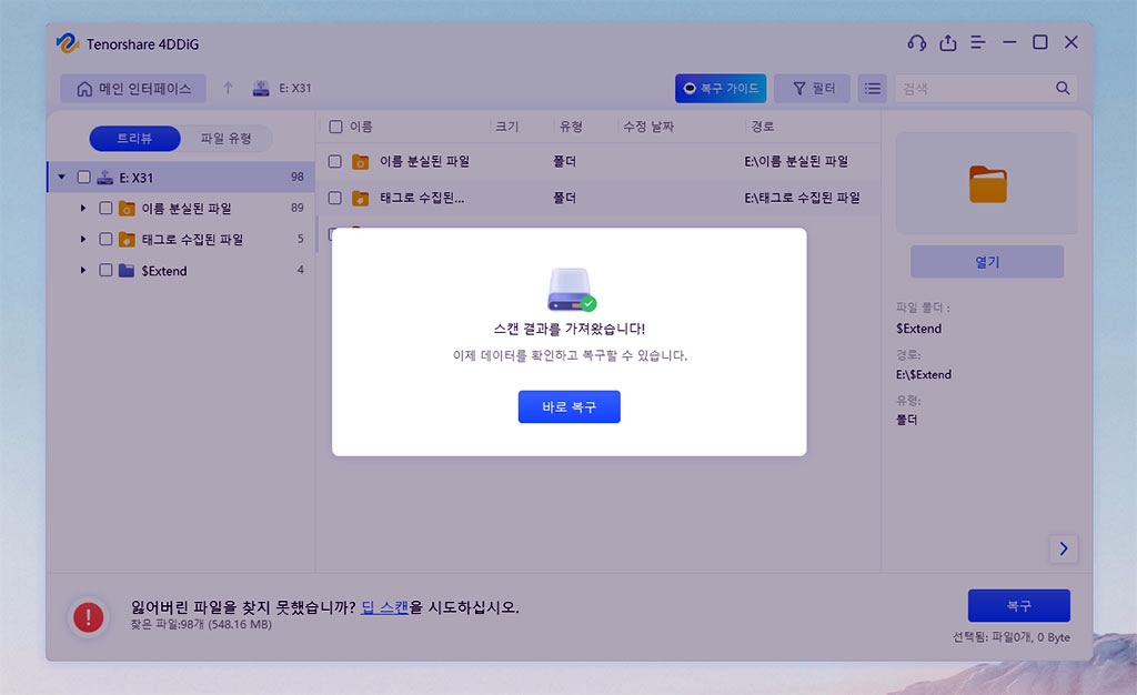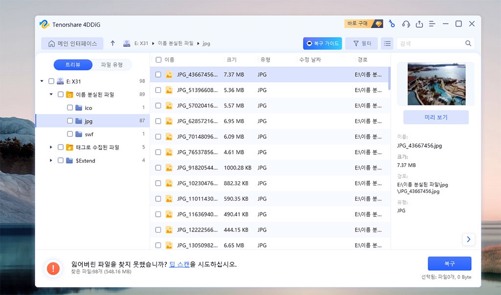 삭제 파일 복구 프로그램인 Tenorshare 4DDiG을 정품 인증 후, 다시 스캔해서 복구했습니다.