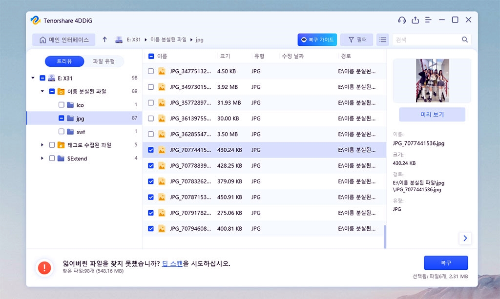 삭제된 파일인 뉴진스 사진이 보이네요. 미리 보기를 통해서 복원할 파일이 맞는지 확인할 수 있습니다.