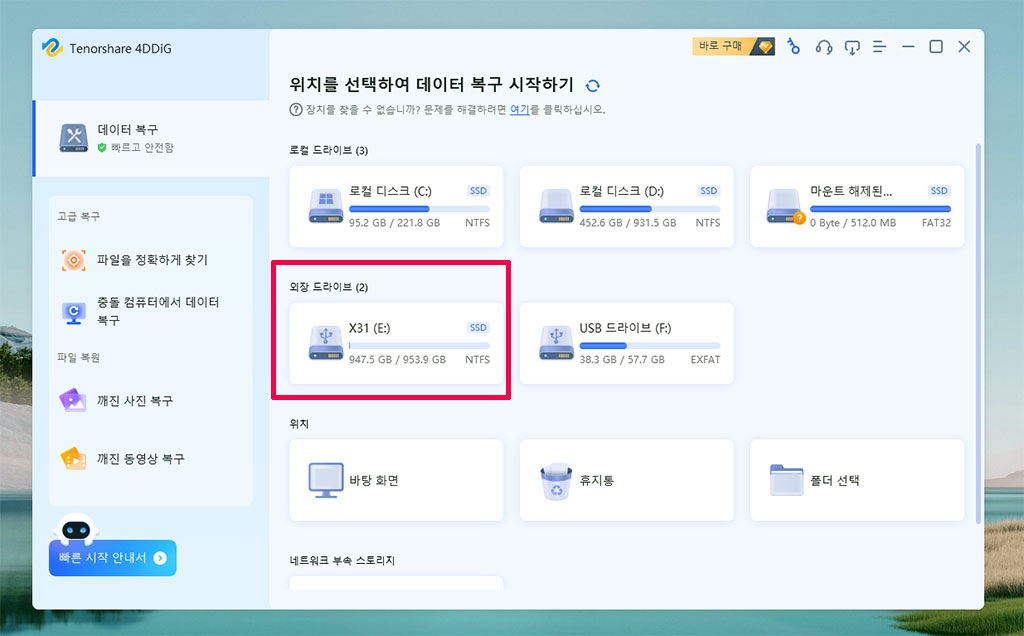 4DDiG는 데이터 복구 프로그램을 실행하면, SSD 외장하드 및 네트워크 드라이브, NAS장치까지 확인할 수 있습니다. E드라이브에 SSD외장하드가 인식되었네요. 파일 복구를 위해서 스캔을 눌러줍니다.
