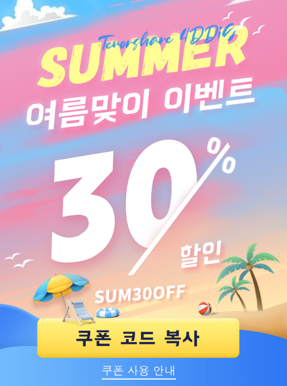 삭제 파일 복구 프로그램인 4DDiG 구매를 계신 분들을 위해 특별한 여름맞이 이벤트를 진행 중이라고 하네요. 이벤트는 30% 할인 혜택을 제공하고 있어 쿠폰 코드로 구매하시는 게 더 좋으실 것 같습니다. 자세한 것을 위의 링클 참고하세요!