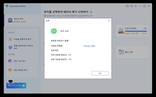 바로 구매를 눌러 라이선스키를 넣고, 삭제 파일 복구 프로그램인 4DDiG을 정품 인증하였습니다.