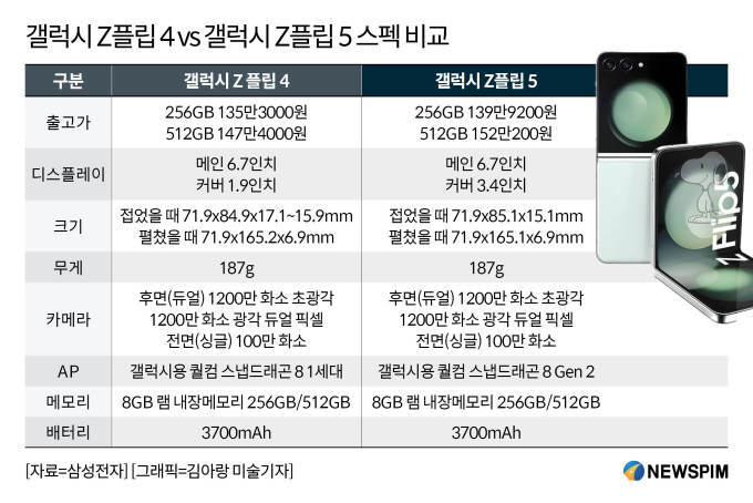 갤럭시 Z플립5는 256GB 모델이 139만9200원, 512GB 모델이 152만200원