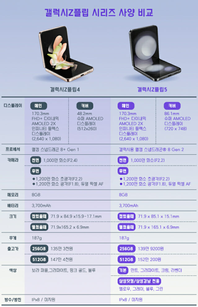 하지만 플립5의 단점은 이전 모델과 비교했을 때 성능적인 변화는 크게 느끼지 못할 수 있습니다. 카메라 기능, 배터리 용량, 메모리 등은 대부분 이전과 동일하며, 가격도 약간 상승한 모습을 보여줍니다.