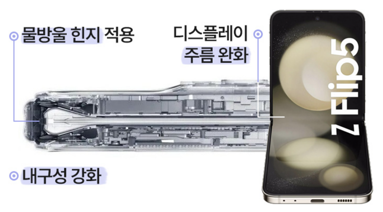 갤럭시 Z 폴드5와 플립5 모두 물방울 형태의 '플렉스 힌지'를 적용해 주름과 두께를 줄였습니다. 접었을 때 보이는 빈틈을 최소화했습니다.