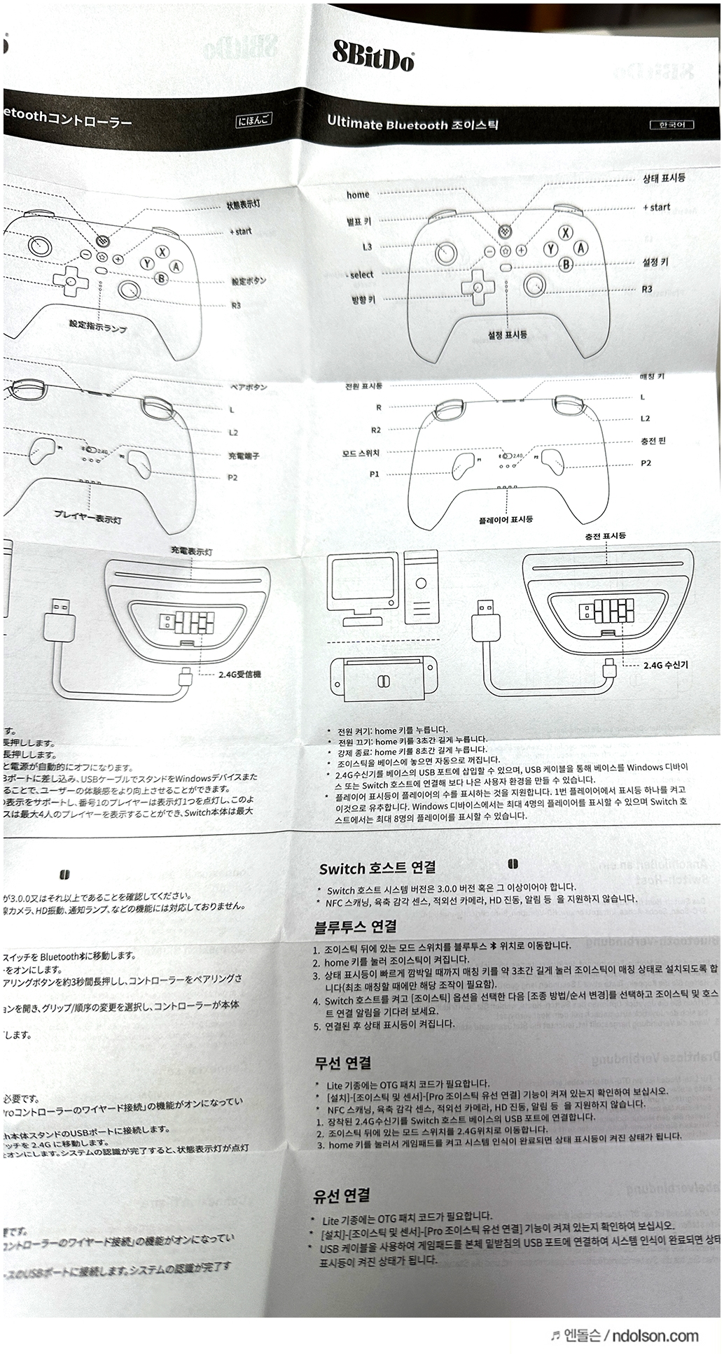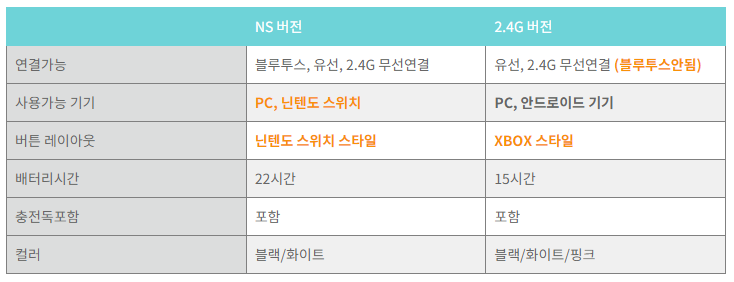 필자는 NS버전을 구매하였지만, 컨트롤러의 특징 중 하나인 2.4GHz 연결도 지원됩니다. 구매할 때 선택하면 됩니다. 블루투스 버전인 NS(닌텐도 스위치)와 2.4GHz 연결도 지원하여 블루투스 동글 없이 PC에서도 사용할 수 있다는 점이 장점입니다.