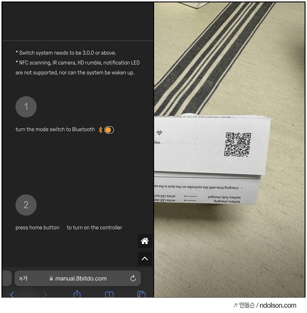 8BitDo 얼티메이트 NS 닌텐도 스위치 컨트롤러의 구성품은 충전 커넥터와 컨트롤러가 있는 데, QR코드 찍으니 사용법이 나옵니다.