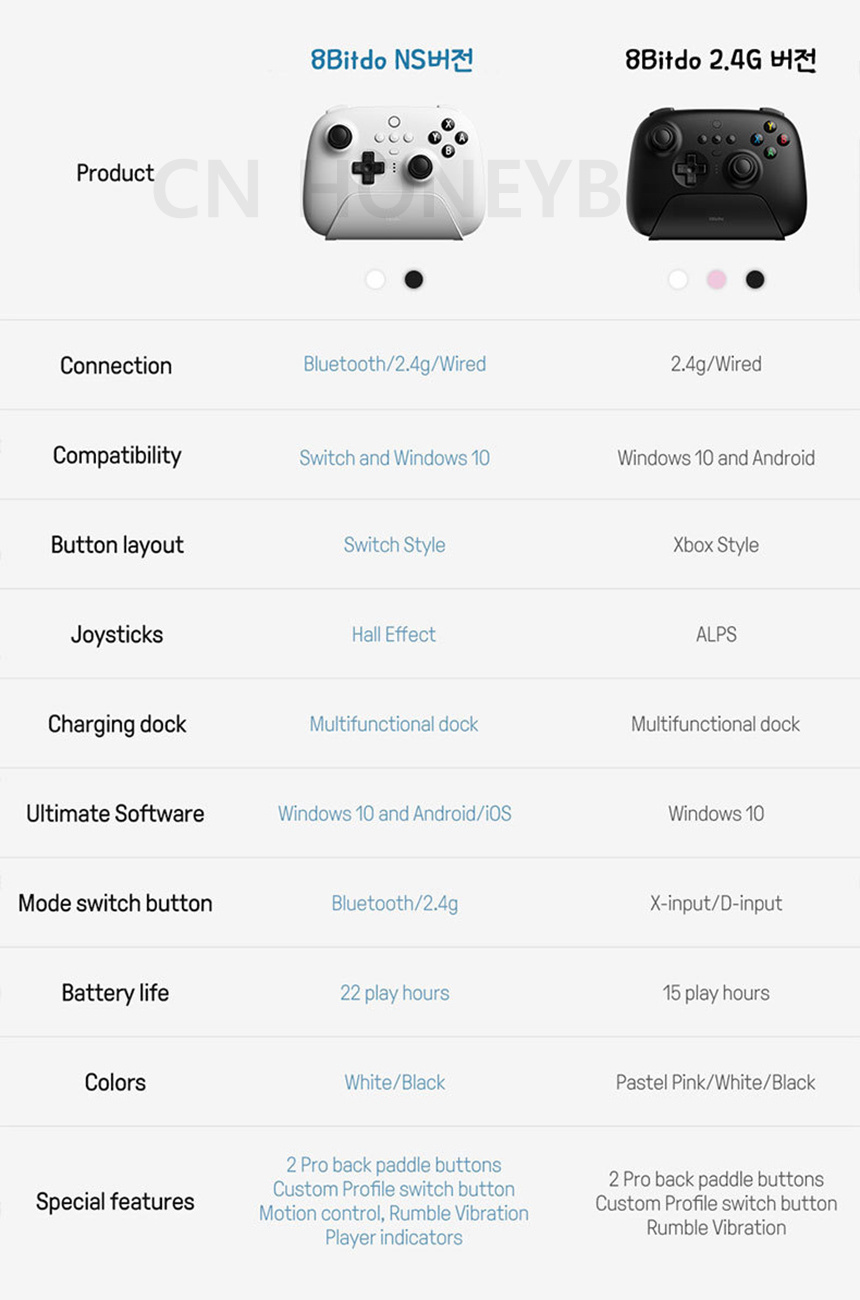 8BitDo 얼티메이트 블루투스 컨트롤러가 얼티메이트 NS 버전과 2.4GHz 버전으로 나눠져 판매되고 있습니다. NS 버전은 닌텐도 스위치와 2.4GHz 연결이 모두 가능합니다. 필자는 컨트롤러는 닌텐도 스위치 프로 컨트롤러로도 사용 가능하며, 게임패드로 젤다 신작 등 다양한 게임을 즐기는 데, 컨트롤이 아주 좋아 탁월한 성능을 발휘하였습니다.