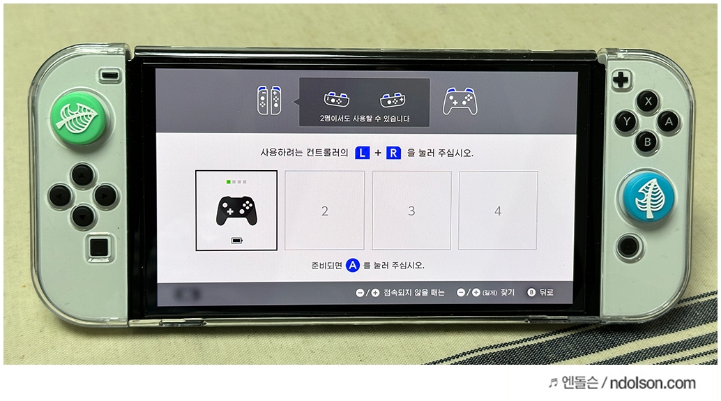 추가하려는 게임컨트롤러의 L/R 버튼을 눌러주면, 닌텐도 스위치에 게임패드가 연결이 됩니다.