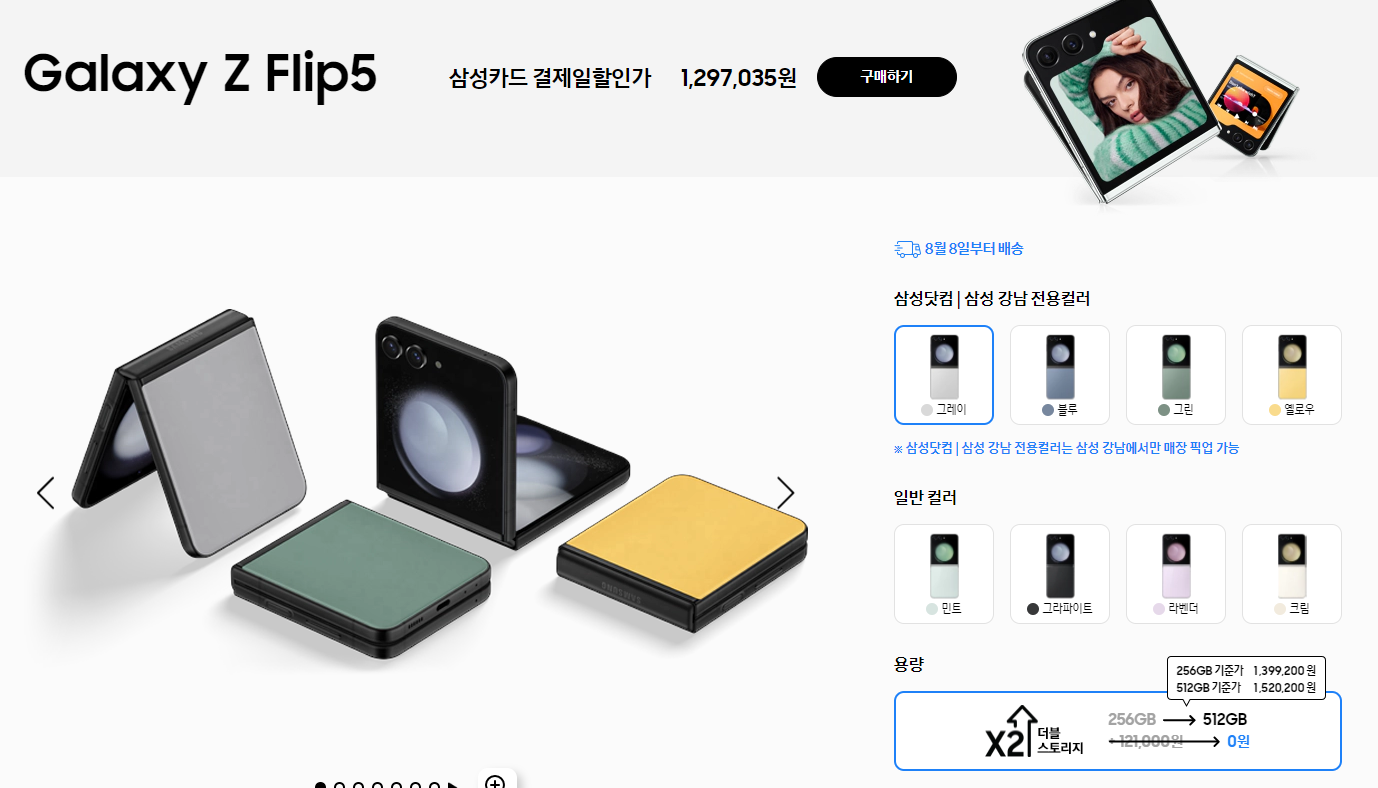 갤럭시Z플립5는 민트, 크림, 라벤더, 그라파이트 4가지 색상으로 선택할 수 있습니다. 또 256GB 모델이 139만 9200원, 512GB 모델이 152만 200원에 판매됩니다. 그렇지만 이번 프로모션에서 구매하면 더블 스토리지로 256GB를 구매해도 512로 업그레이드됩니다!