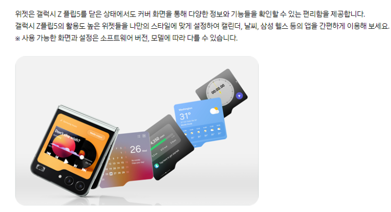 갤럭시 Z 플립5의 커버 위젯을 설정하면, 홈 화면으로 돌아가지 않고도 편리하게 여러 기능을 이용할 수 있습니다.