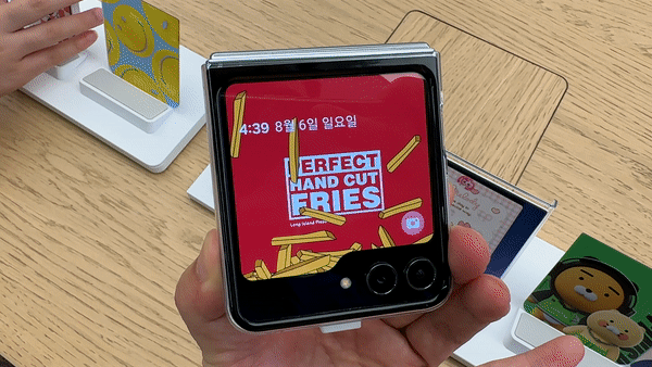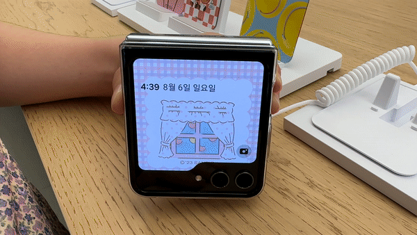 갤럭시 Z 플립5의 메인 화면은 6.7인치의 22:9 비율이지만, 커버 화면은 3.39인치 720 × 748 해상도의 Super AMOLED 패널과 240Hz의 터치 샘플링 레이트를 지원합니다. 또 커버화면은 기존 플립 시리즈와는 다르게 접었을 때 디스플레이가 외부로 노출되는 형태라 많은 사람들의 관심을 받고 있습니다.