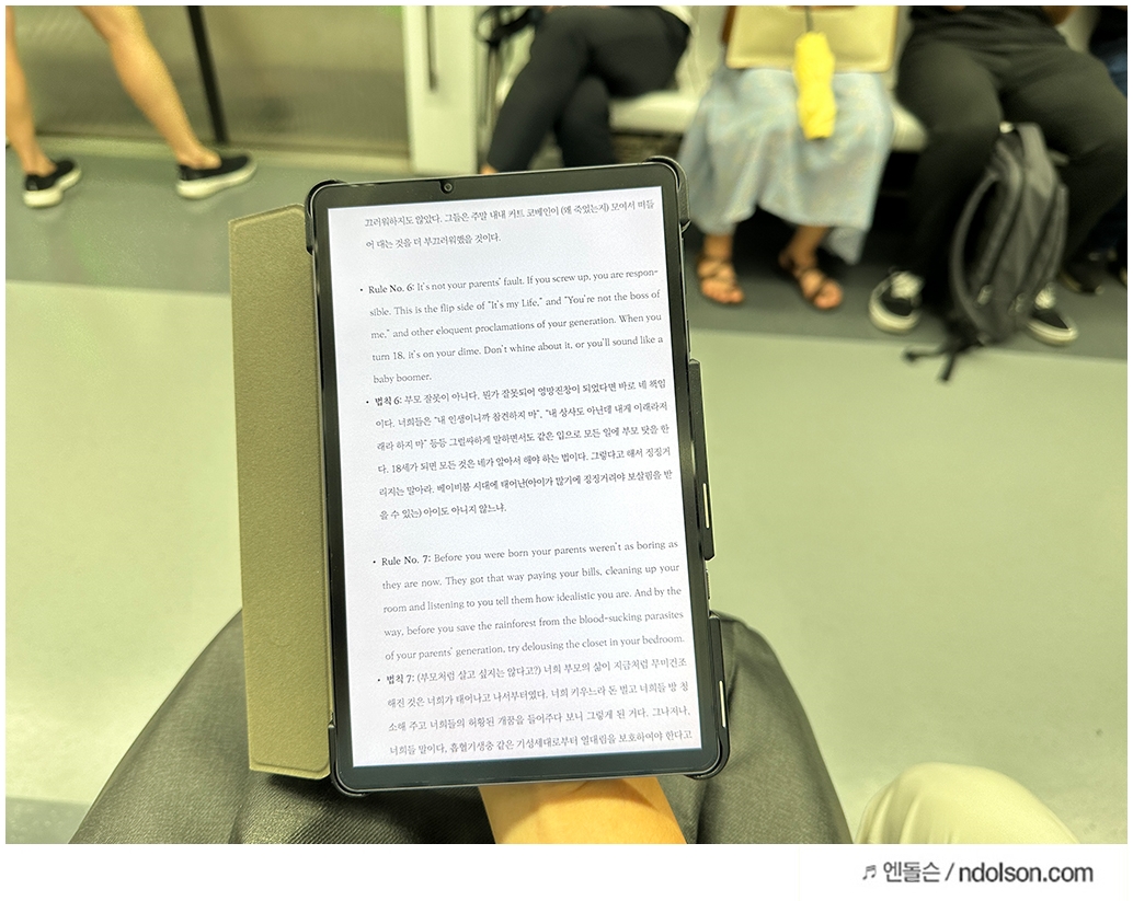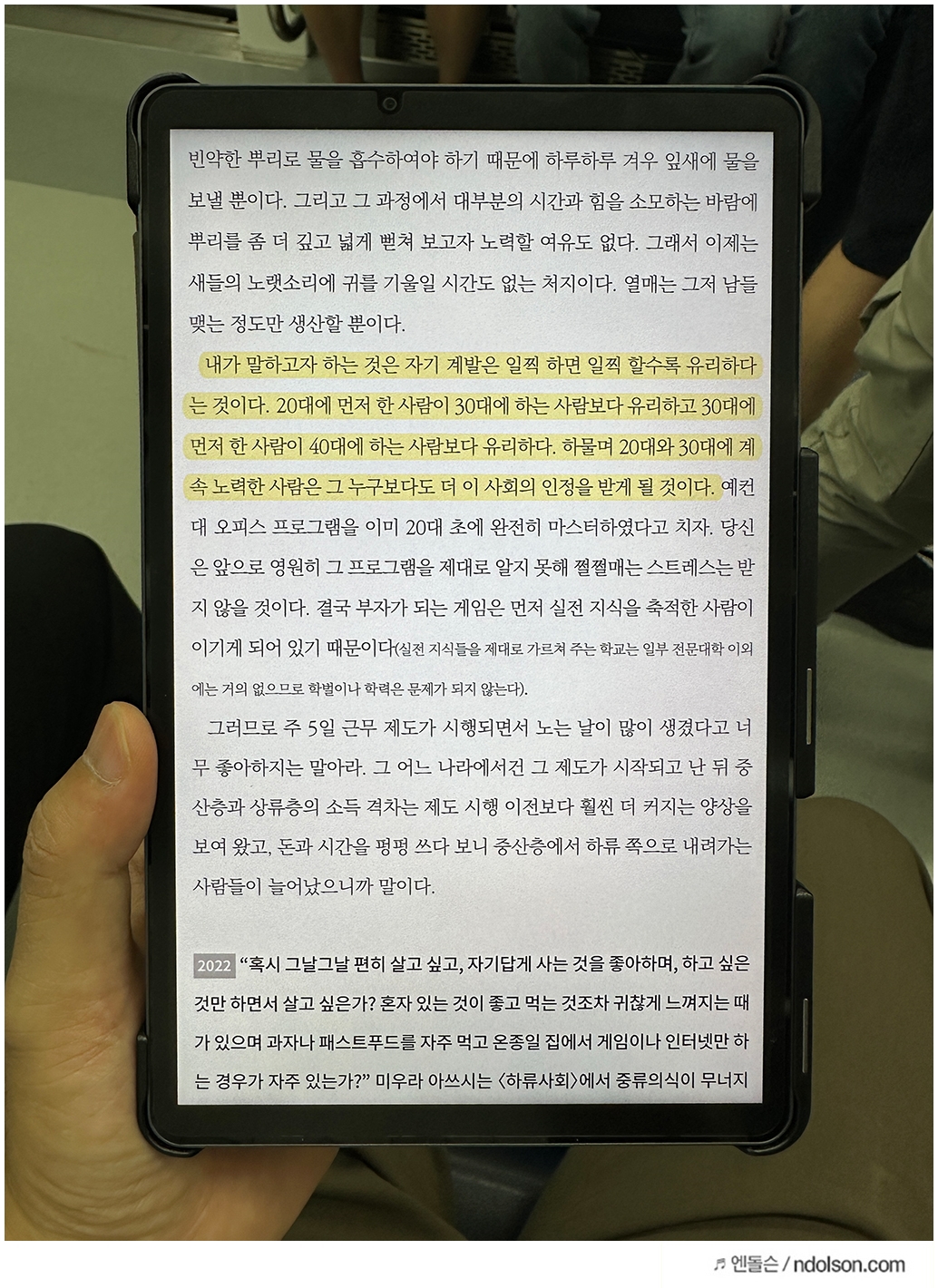 세이노의 가르침 PDF를 크레마 뷰어로 즐기고 있습니다. 전자책 읽기 좋은 8.8인치 태블릿이라 좋습니다.
