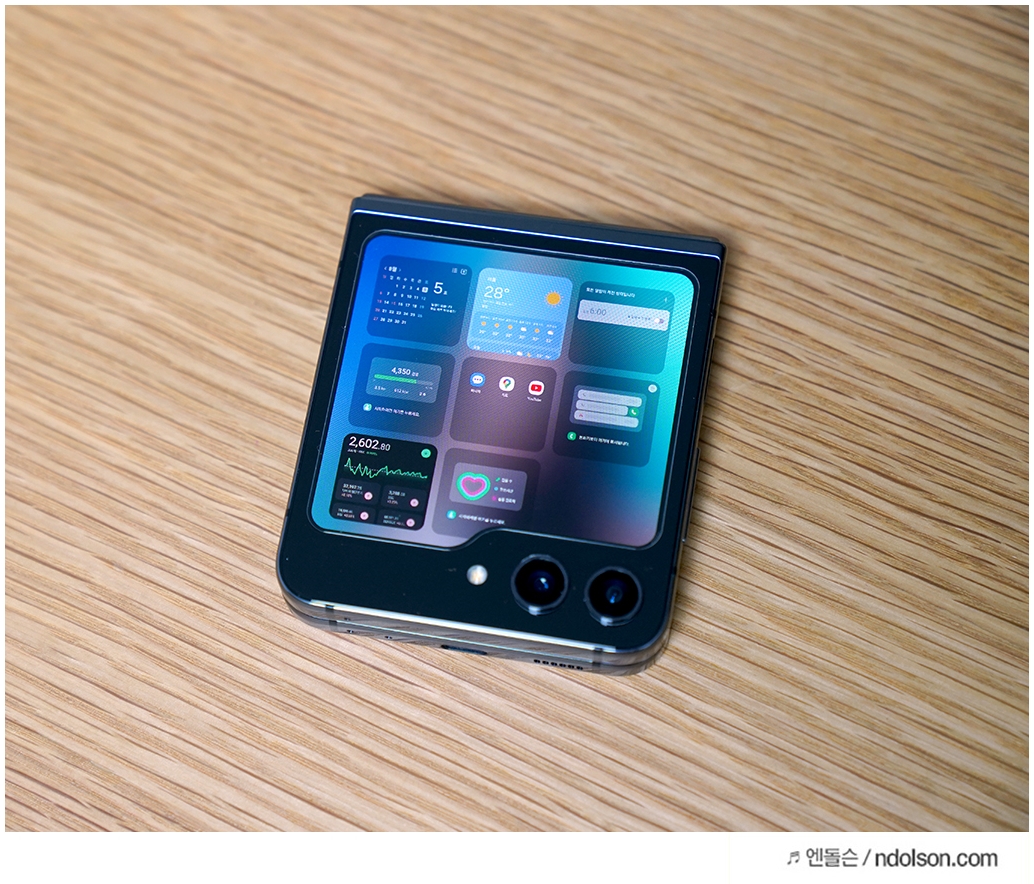 또 플립5가 이제는 완전히 밀착되는 플렉스힌지로 빈틈이 없습니다. 위젯도 커버화면에서 바로 사용할 수 있어서 편하네요. 음악재생이나 동영상 재생, 웹페이지 보기 좋아요.
