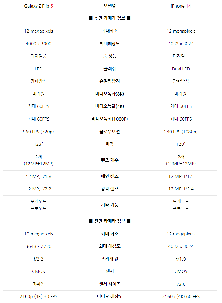 아이폰14 프로 vs 갤럭시Z 플립5 스펙 비교