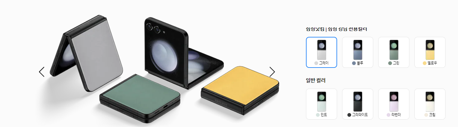 플립 5의 자급제 전용 모델인 그린, 옐로우, 그레이, 블루 색상도 삼성닷컴과 삼성 강남에서 구매할 수 있습니다.