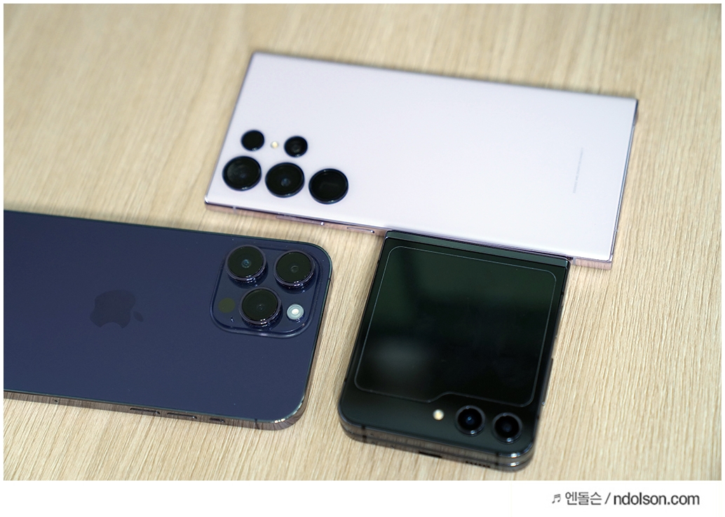 아이폰 14 프로맥스 딥퍼플, 갤럭시 S23울트라 라벤더, Z플립5 그라파이트 색상 순입니다. 확실히 바(Bar) 형태의 스마트폰과 폴더블의 매력은 다릅니다. 크기 작고 이쁜 건 갤럭시Z플립5를 따라갈 수 없네요.