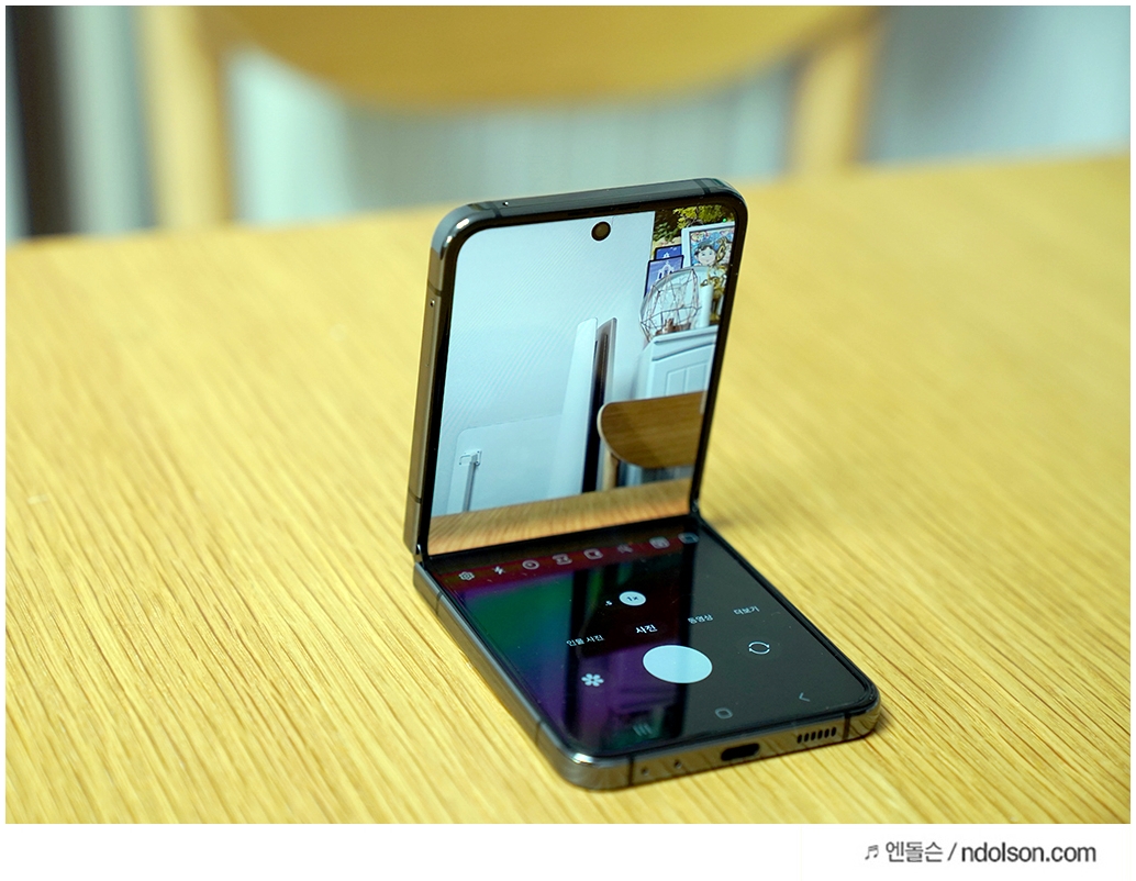 카메라 각도 조절은 플립5가 아주 좋습니다. 힌지로 프리스탑이 되서 원하는 각도 조절이 가능합니다. 세워두고 촬영할 수 있어 플립5의 카메라 찍는 재미가 더 좋습니다.