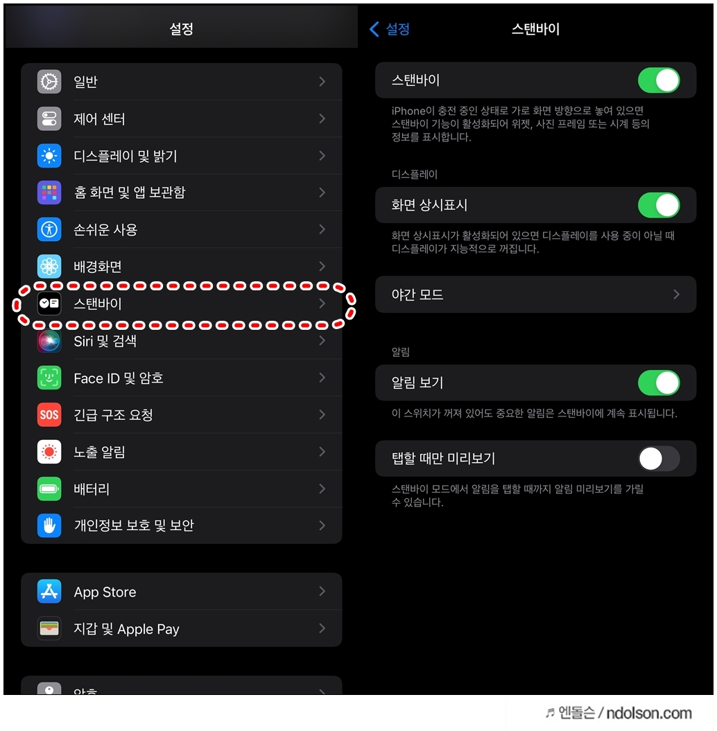 iOS17 베타로 업데이트하고 나면, 설정 > 일반 > 스탠바이(StandBy) 가 생깁니다. 야간모드일 때 켜지고, 아이폰을 항상 충전할 때 켜지게 할 건지 등의 설정을 할 수 있습니다.