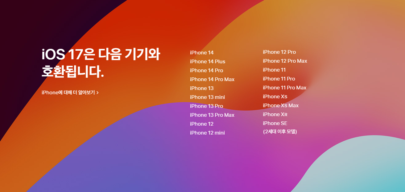 iOS 17의 업데이트를 지원하는 아이폰들입니다. iPhone 14, iPhone 14 Plus, iPhone 14 Pro, iPhone 14 Pro Max, iPhone 13, iPhone 13 mini, iPhone 13 Pro, iPhone 13 Pro Max, iPhone 12, iPhone 12 mini, iPhone 12 Pro, iPhone 12 Pro Max, iPhone 11, iPhone 11 Pro, iPhone 11 Pro Max, iPhone XS, iPhone XS Max, iPhone XR, 그리고 iPhone SE(2세대 이후 모델)은 지원합니다.