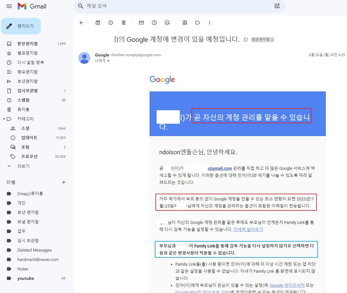 구글 메일이 왔스니다. 자녀의 구글 계정이 곧 나이 제한이 풀린다는 말입니다.