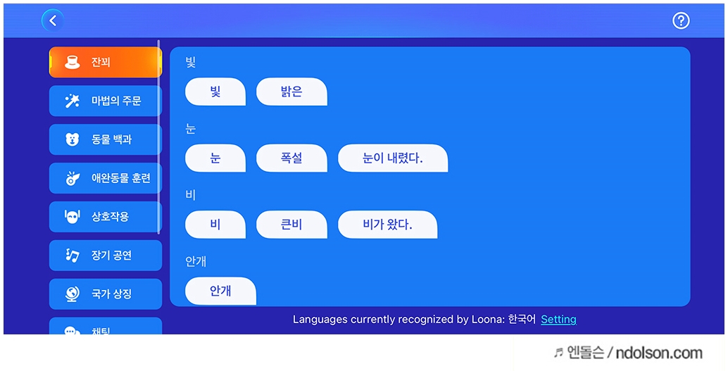 루나로봇 앱에서 보면 다양한 음성 명령을 지원합니다.