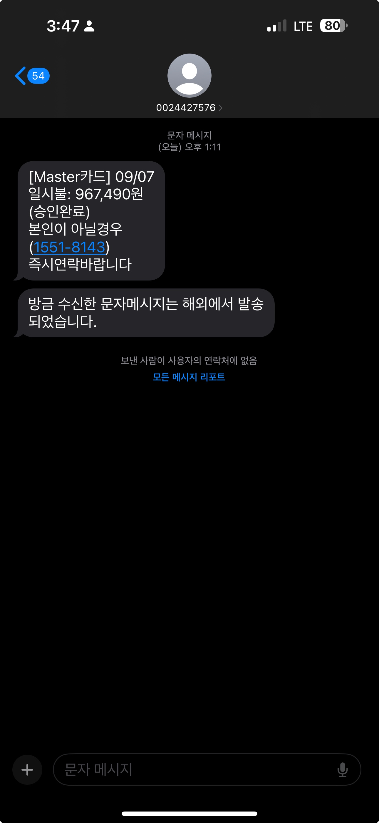 (이런 문자 속지마세요! ) [Master카드] 09/07 일시불: 967,490원 (승인완료) 본인이 아닐경우 (1551-8143) 즉시연락바랍니다.