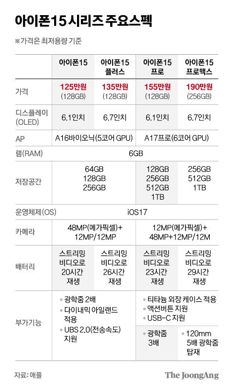 아이폰15 시리즈의 출고가는 아이폰 기본 모델이 799달러(128GB), 플러스는 899달러(128GB), 프로는 999달러(128GB), 프로맥스는 1천199달러(256GB)부터 시작됩니다.