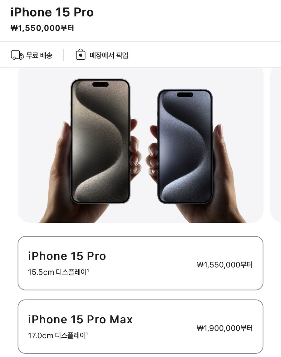 아이폰15 시리즈는 여전히 6.1인치형(15.4㎝) 기본 모델과 6.7인치형(17.0㎝) 플러스, 고급 모델인 6.1인치형 프로와 6.7인치형 프로맥스로 구성되어 있습니다.