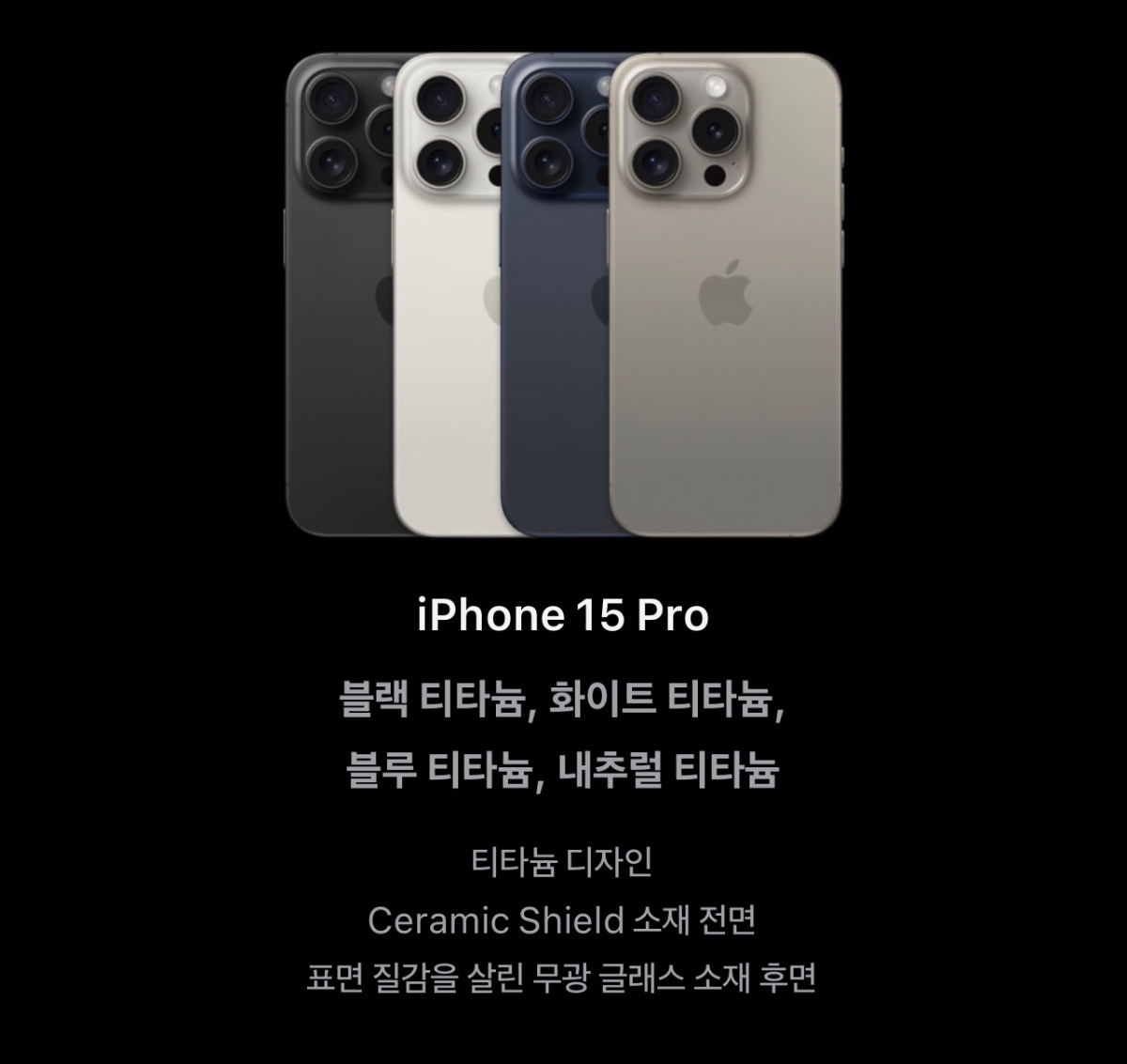프로와 프로 맥스 고급 모델은 '티타늄' 케이스로 변화를 가져왔는데, 맥스로 크지만, 가벼우면서도 내구성이 향상되었습니다.