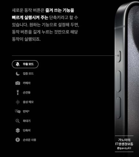 * 단축어 : 아이폰 15 프로의 액션 버튼은 메시지를 보내거나 앱을 시작하는 것과 같은 사용자 지정 단축어를 적용할 수 있습니다.