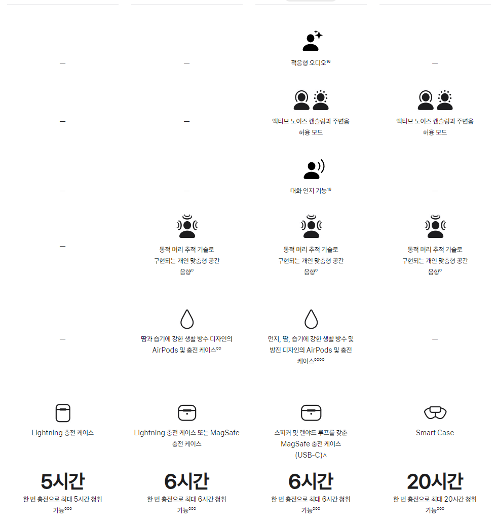 - 단일 충전으로 최대 6시간의 음악 청취 (공간 음향 및 헤드 트래킹 사용 시 최대 5.5시간)