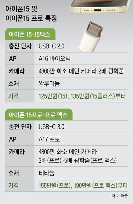 USB-C 지원은 동일하지만, 스펙 급나누기가 있습니다. 아이폰15 프로와 아이폰15 플러스는 USB-C 충전 케이블을 사용할 수 있습니다.