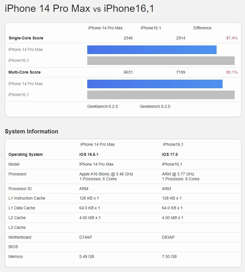 비교적, A16 바이오닉 칩을 장착한 iPhone 14 Pro의 Geekbench 6 테스트는 싱글 코어 성능 2,500과 멀티 코어 성능 6,400의 평균 점수를 기록했습니다.