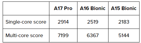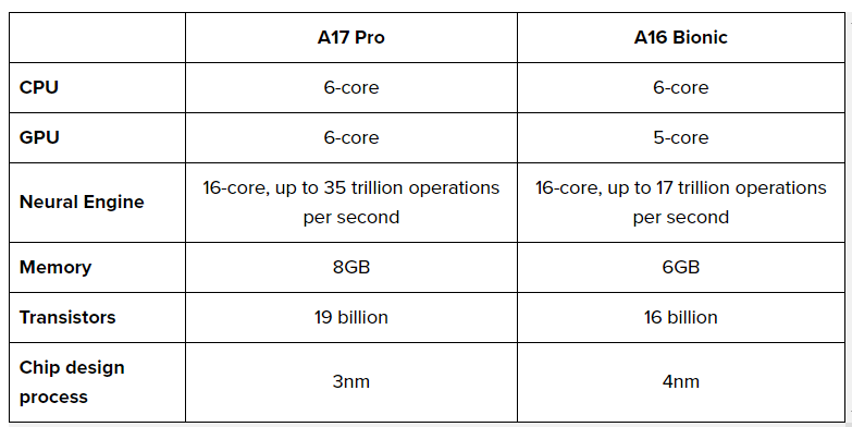 메모리는 A17 Pro는 A16 Bionic의 6GB에서 8GB의 RAM 증가하였습니다. A17 Pro의 GPU는 A16 Bionic보다 더 큰 개선을 얻었습니다. 성능과 효율성, 복잡한 응용 프로그램, 새로운 렌더링 기능, 속도의 증가를 볼 수 있습니다.