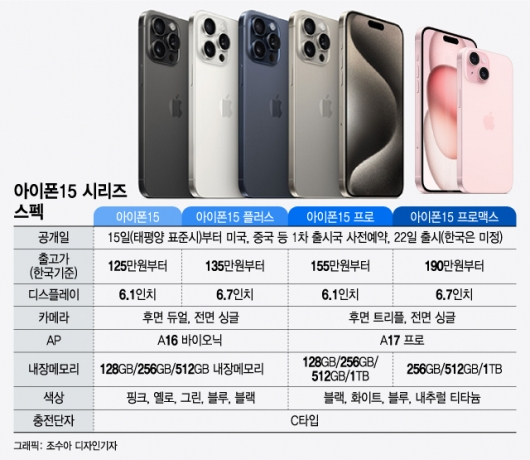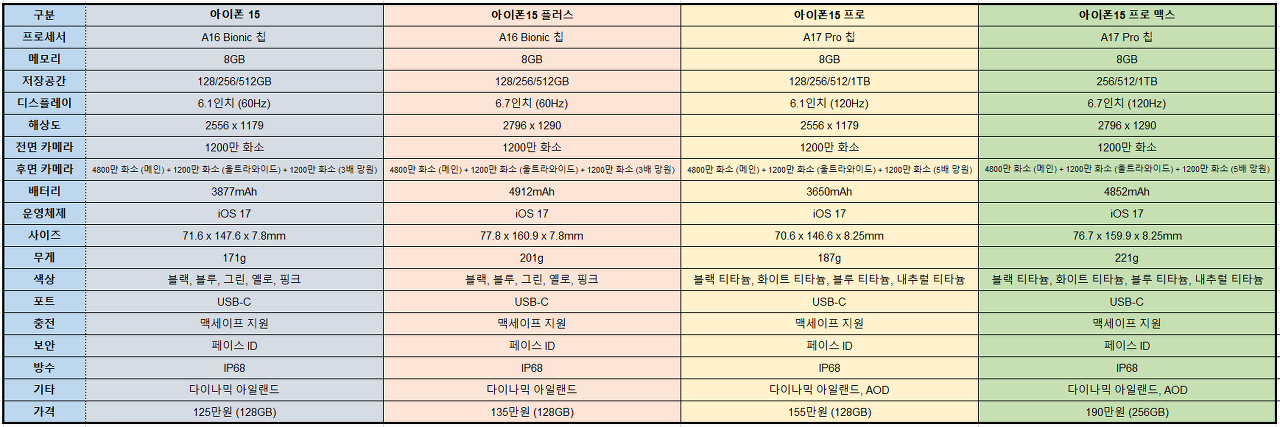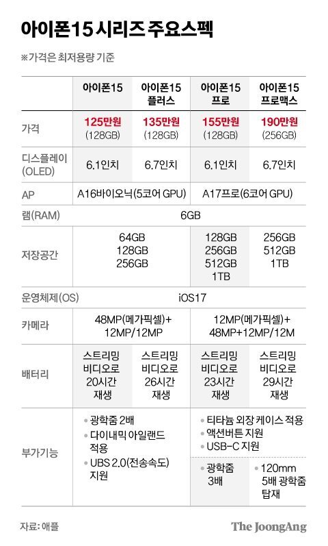 - 아이폰 15 기본 모델: 799달러 (128GB)