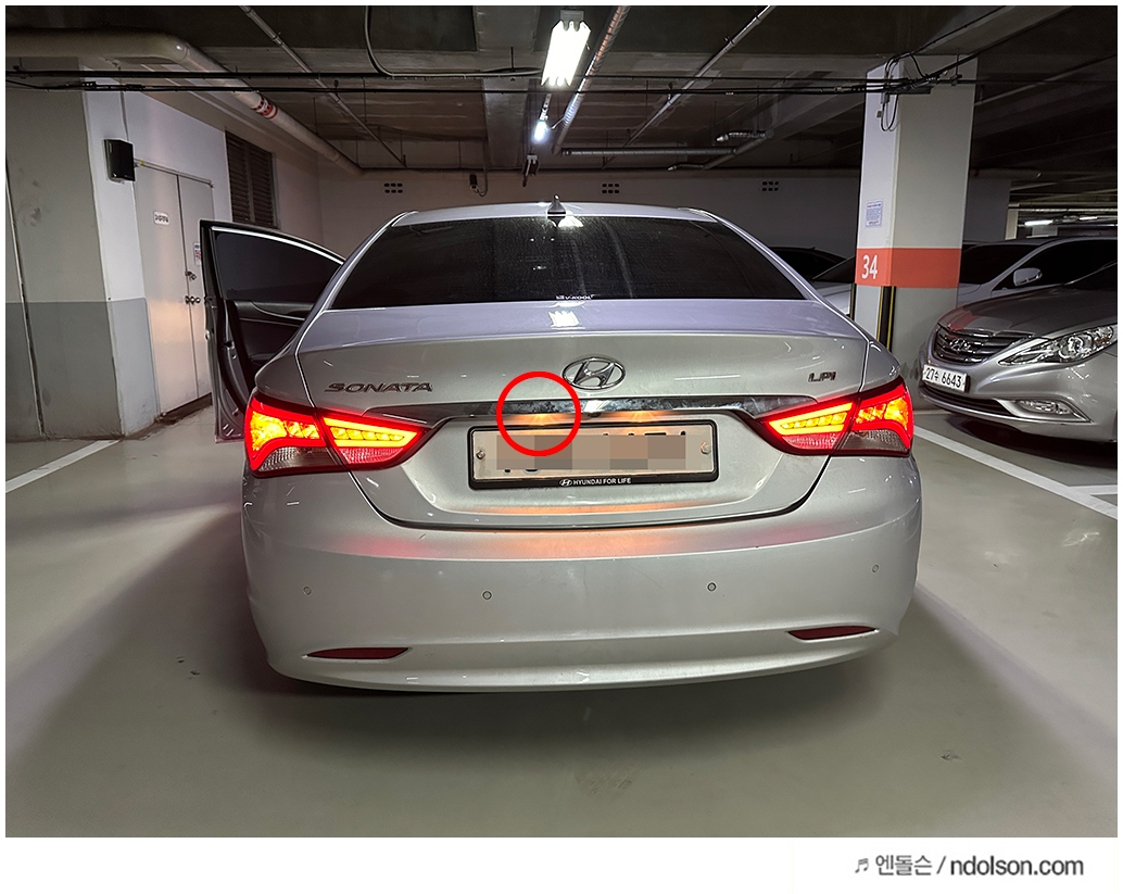 YF소나타 차량의 후면의 번호판 등 전구가 들어온 것과 전구가 고장 난 것의 차이가 확연히 나죠?