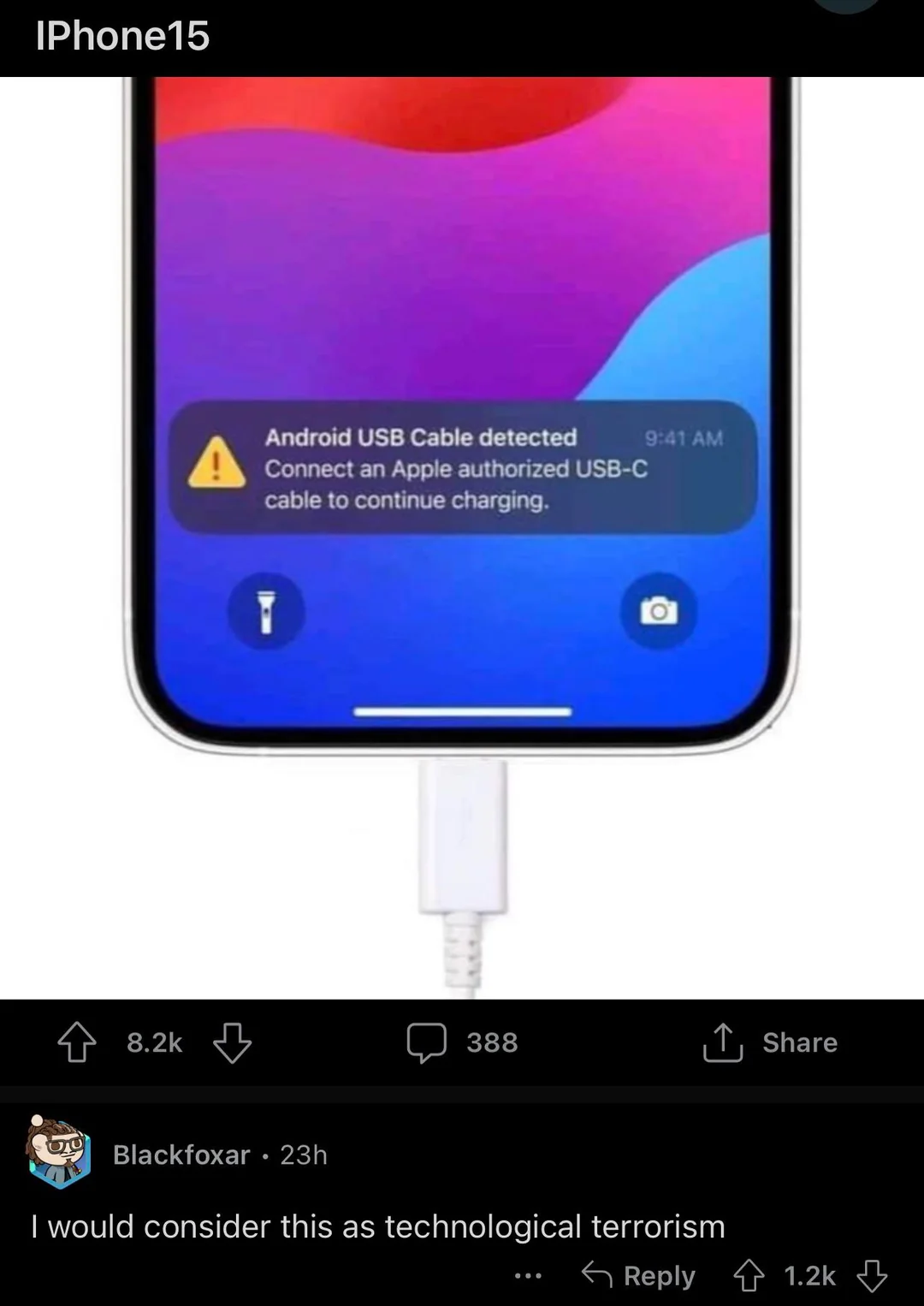 TMI : 아이폰15에 USB-C 케이블을 연결하였지만, 안드로이드 USB-C 케이블을 꽂지 말라는 경고! 애플 인증 케이블만 허락한다는 것이 가요 ㅠㅠ