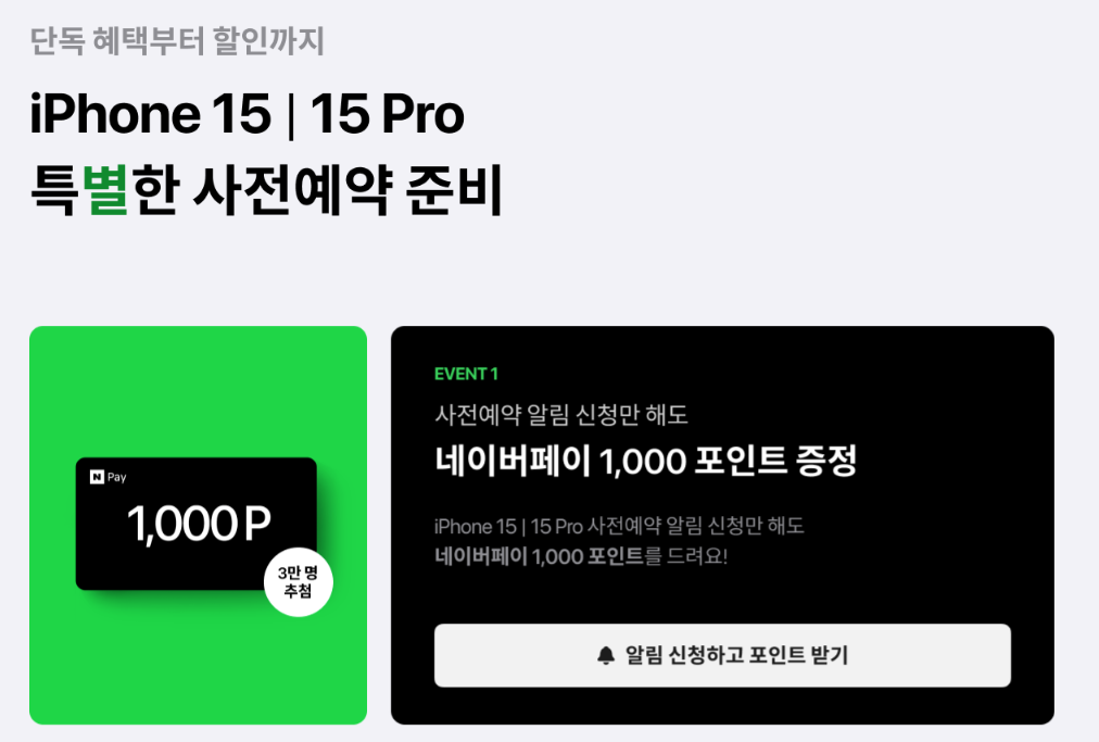 사전예약 알림을 신청한 모든 고객에게 네이버페이 1000포인트를 지급하고, 스타벅스와 협업한 행사도 진행합니다. 또한 아이폰15 시리즈 1차 사전예약 대상자에게는 '당일 배송' 서비스와 오프라인 매장 픽업을 제공합니다.