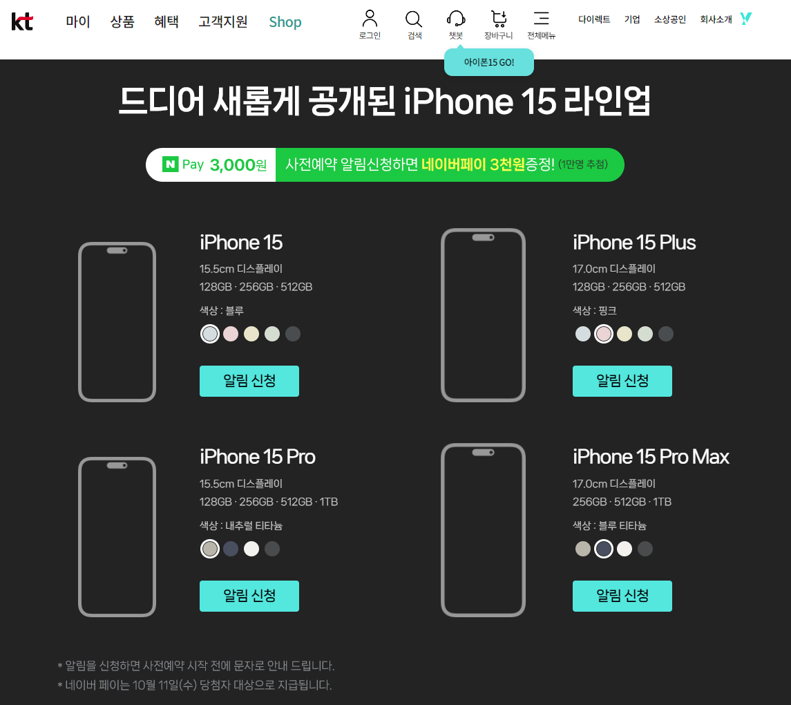 KT 통신사 아이폰 15 사전예약 알림 신청자 1만명에게 네이버페이 3000원을 증정하며, 새벽배송 서비스도 제공합니다. 또한 아이폰15 시리즈 전용 액세서리를 지급합니다.