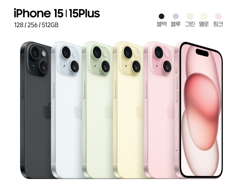 아이폰15 일반/플러스 모델에는 핑크, 옐로, 그린, 블루, 블랙에서 골라볼 수 있습니다.
