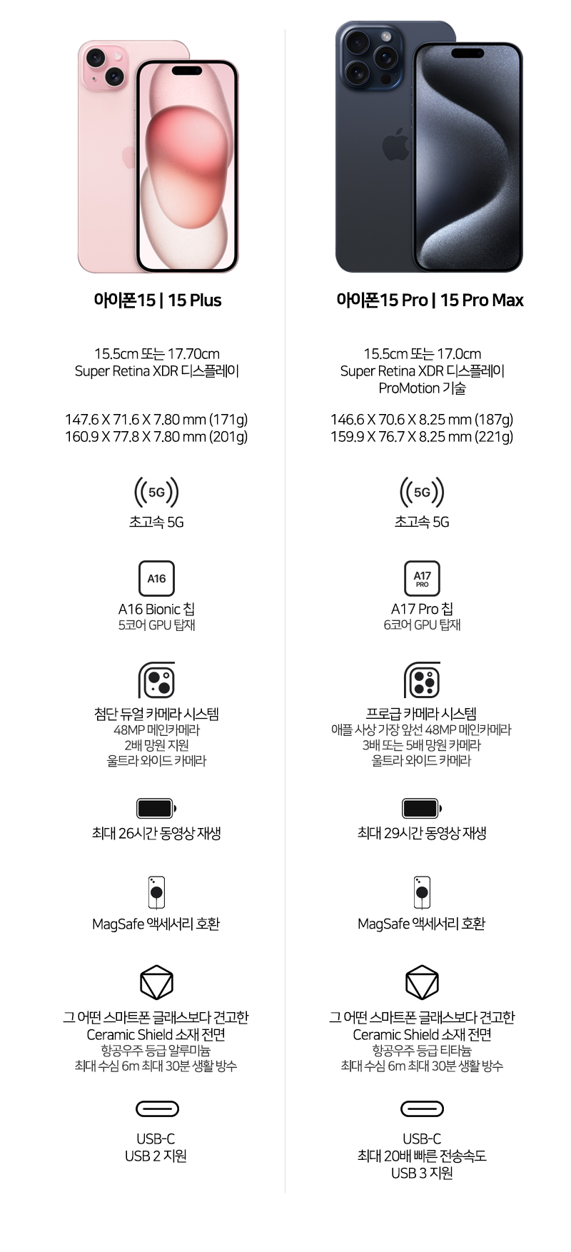 아이폰 15 프로와 아이폰 15 프로 맥스는 새로운 티타늄 소재 덕분에 완전히 새로운 색상 범위가 제공됩니다. 덕분에 티타늄 변색 이슈가 있어 애플에서 변색시 가이드가 나오기도 하였습니다. 아무튼 아이폰 15과 아이폰 15 프로 시리즈는 서로 다른 색상 옵션을 가지고 있어 특정한 색상을 원하는 경우, 해당 모델을 원하는 색상으로 구입할 수 없습니다.