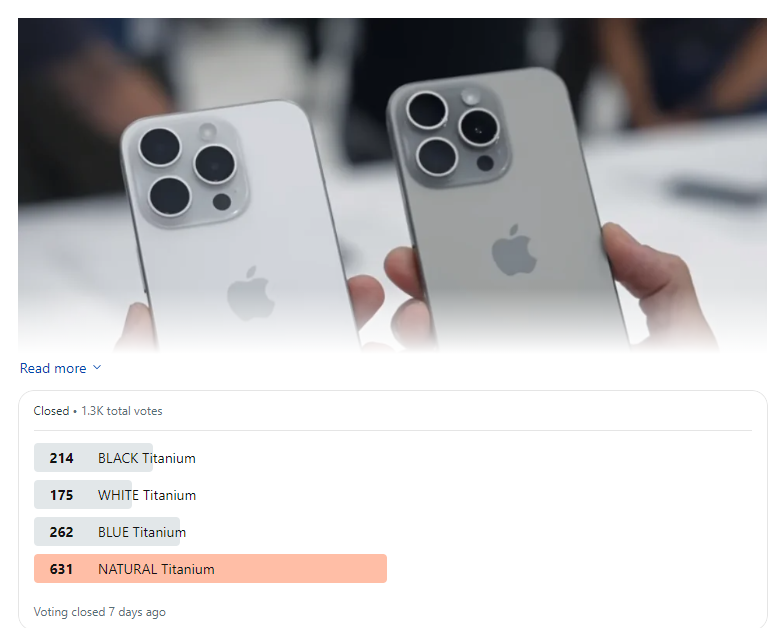 아이폰15 프로 선호하는 색상 투표 결과, 블랙, 화이트, 블루, 내추럴 티타늄