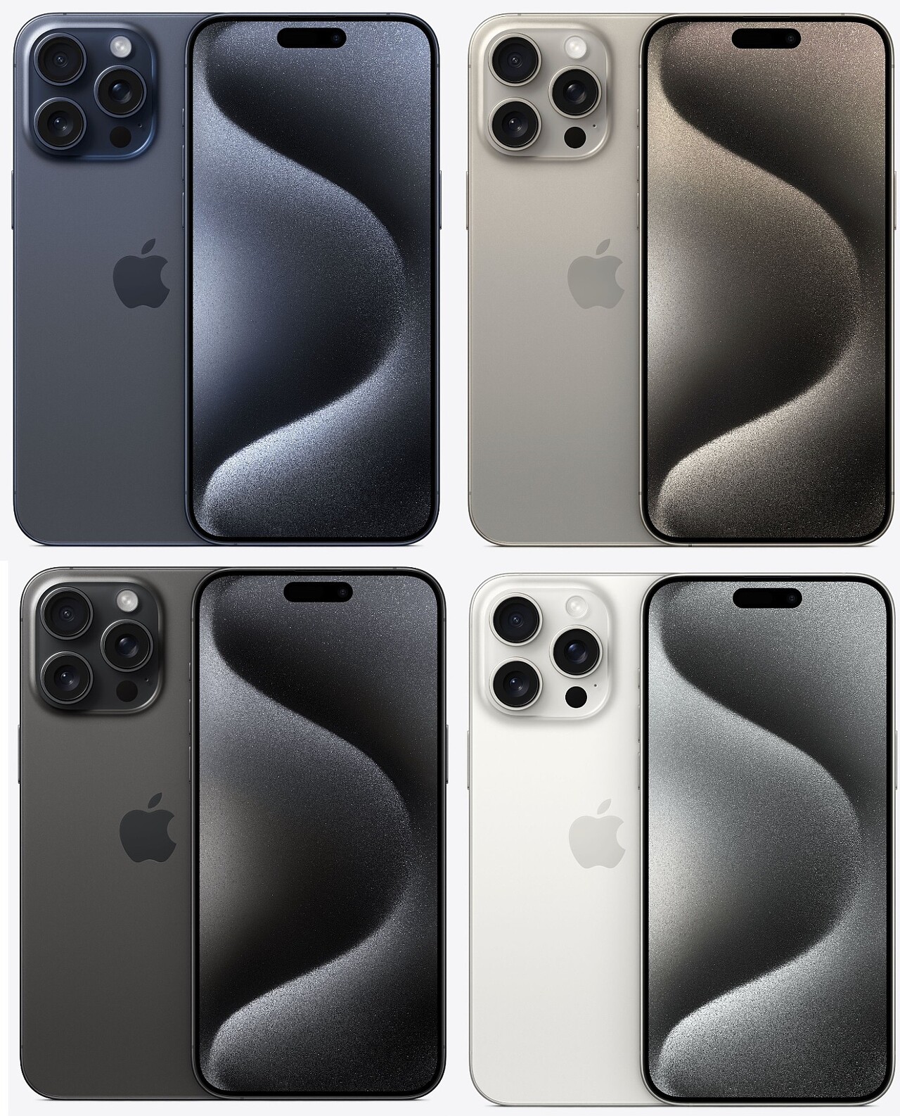 아이폰15 프로/프로맥스는 블랙 티타늄, 화이트 티타늄, 내추럴 티타늄, 블루 티타늄 색상으로 선택할 수 있습니다.