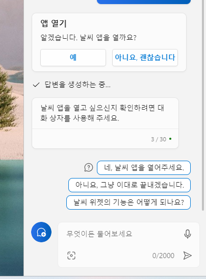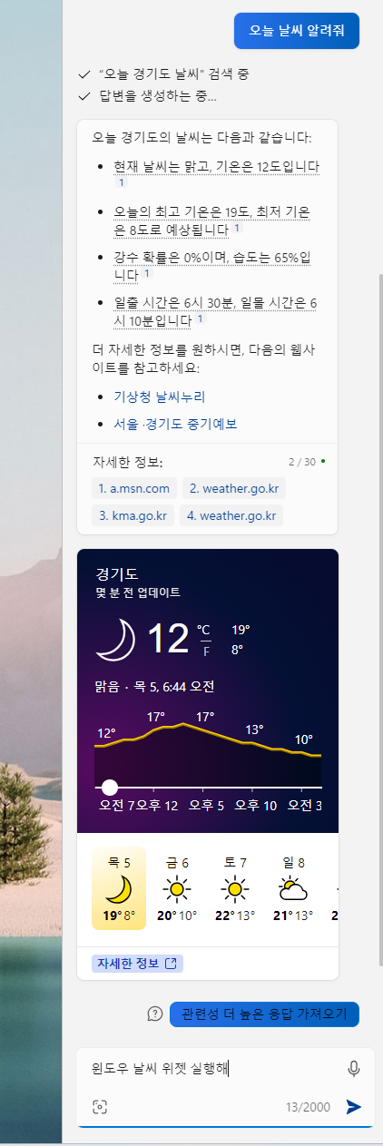 채팅을 하듯 궁금한 날씨 정보 등도 물어보면, 빙챗을 이용하여 검색하여 실시간 정보를 제공합니다.