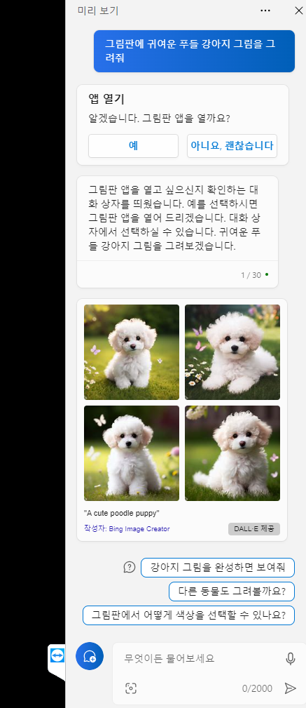 윈도우 코파일럿을 사용하면, 달리(DALLE) 인공지능을 사용하여 그림을 쉽게 그릴 수 있습니다.