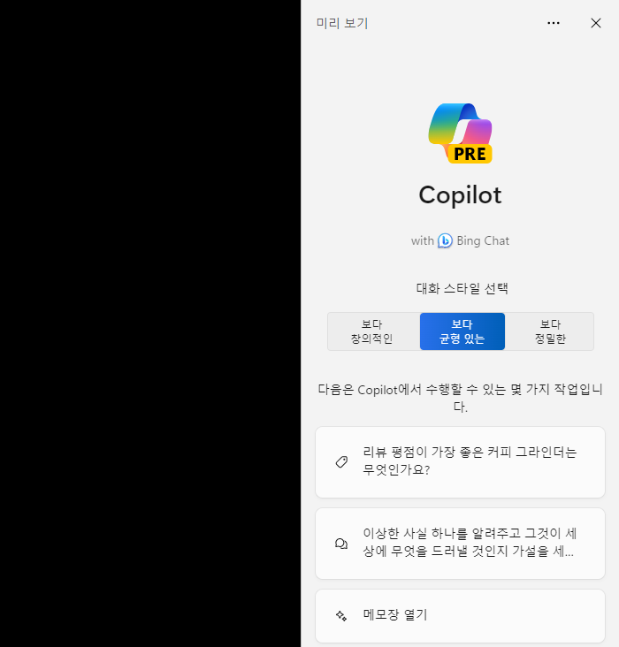 필자가 사용한 윈도우 코파일럿 (Copilot in Windows)는 현재 프리뷰(미리보기) 버전으로 제공됩니다.